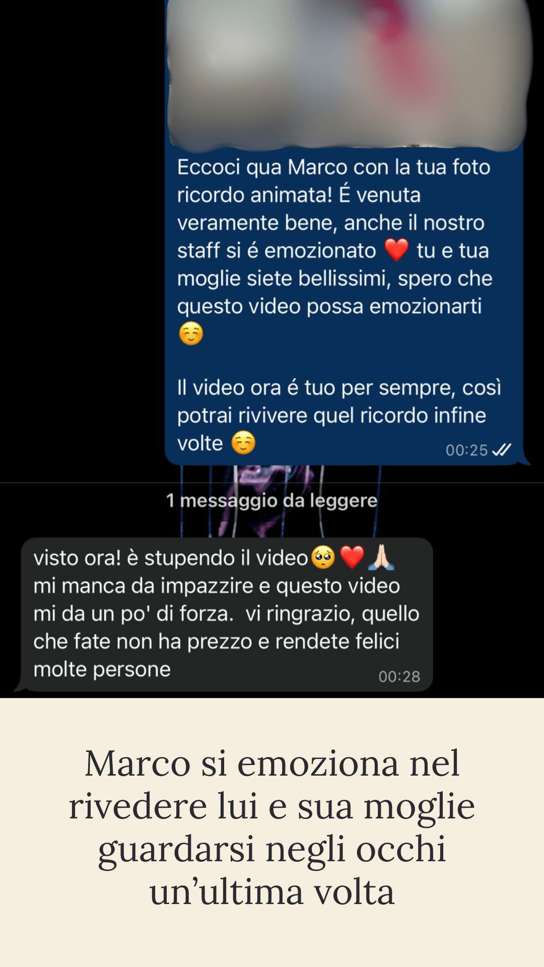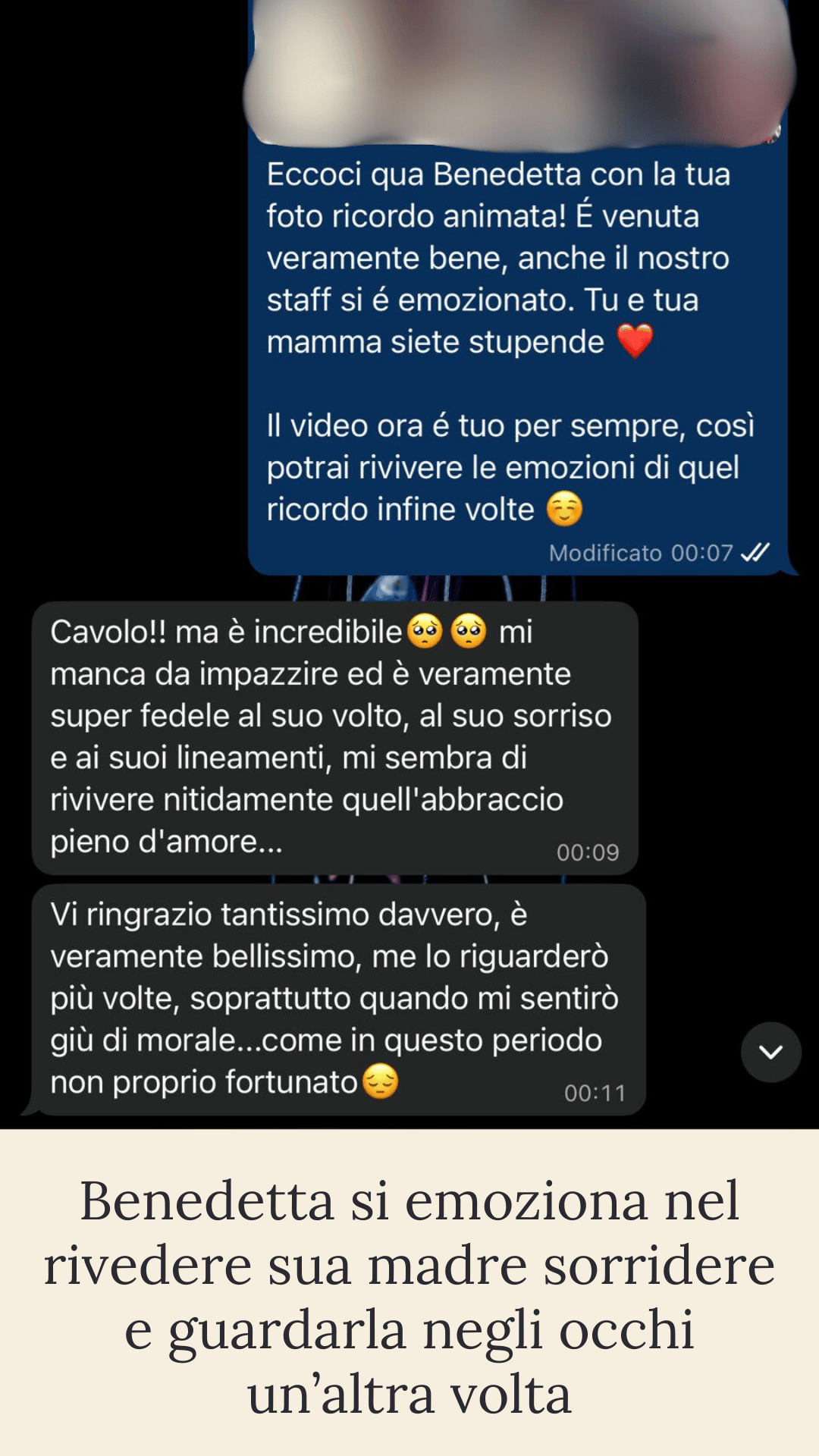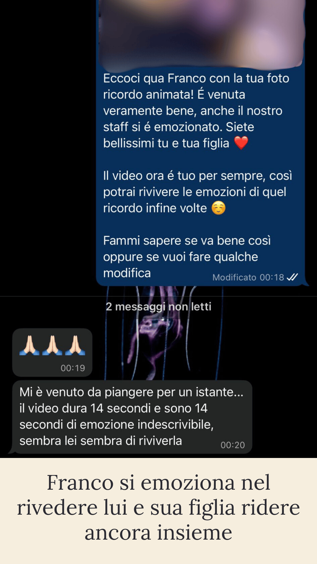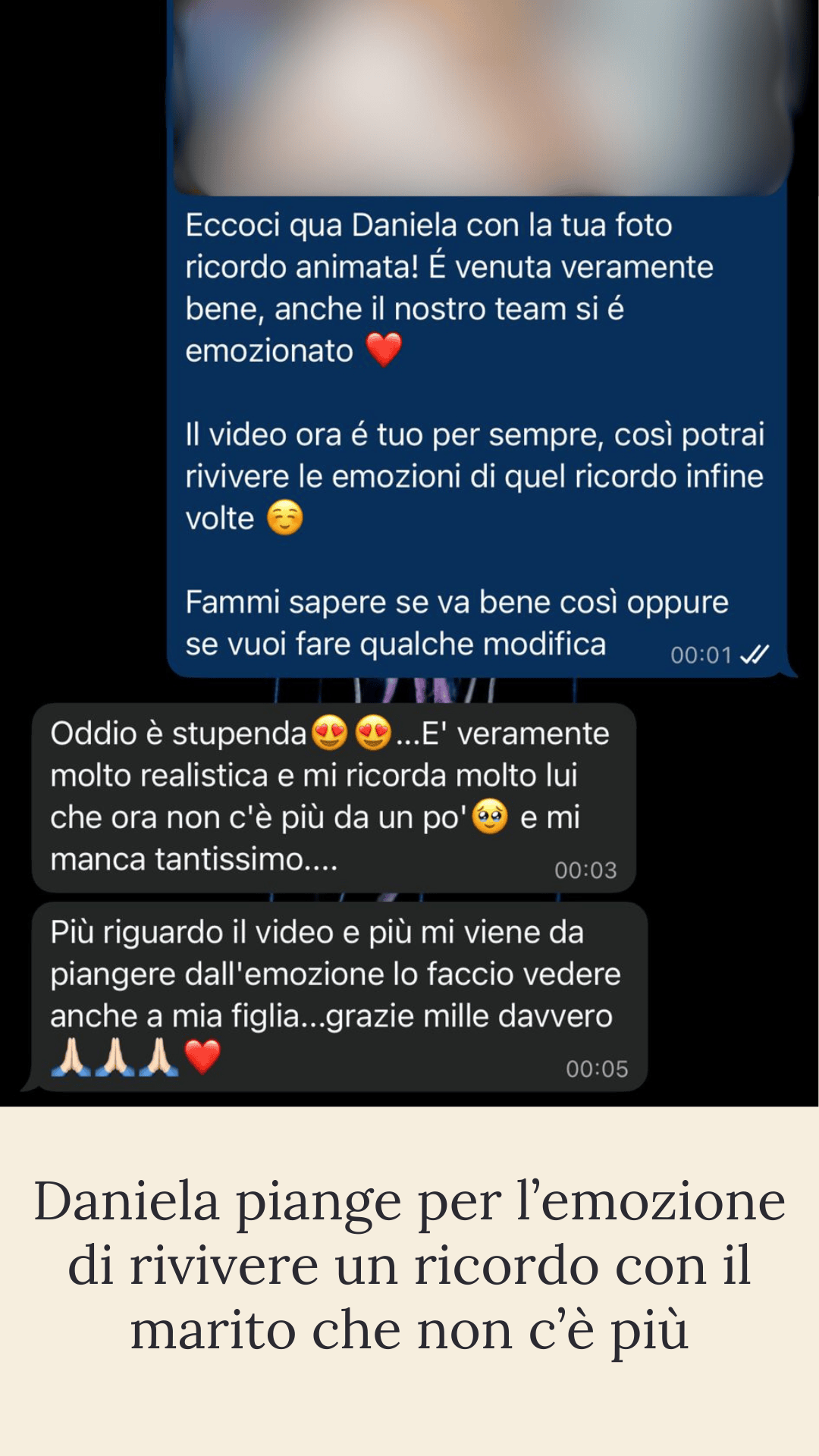 Per un contributo di 9,99€ e in meno di 45 minuti trasformiamo le tue foto in video animati dei tuoi cari per rivivere emozioni che sembravano perdute ❤️