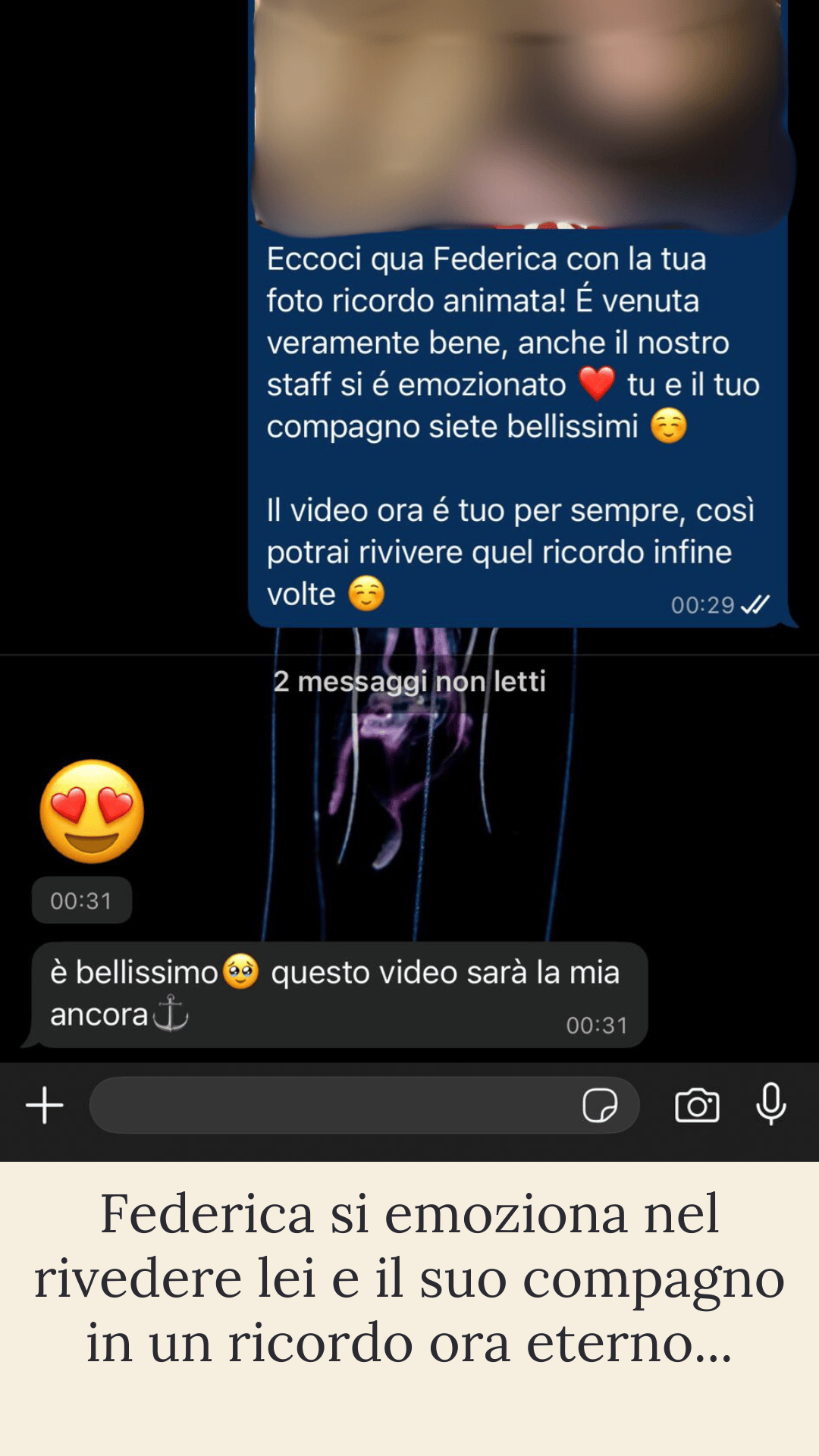 Clicca qui sotto per scriverci la tua richiesta su Whatsapp e ricevere OGGI STESSO la tua foto-ricordo animata ❤️